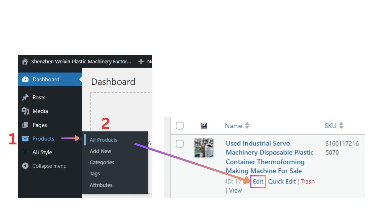 WordPress后台左侧菜单 – Products – All Products – 光标悬浮在产品上方时,会显示【Edit】选项,点击进入单个产品编辑页面。