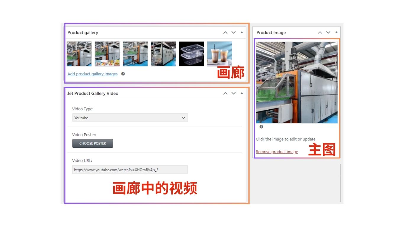 - Jet Product Gallery Video为产品特色视频,每款产品只有一个,显示在Product Gallery的第一个位置。支持Youtube视频、Vimeo视频、站内视频。