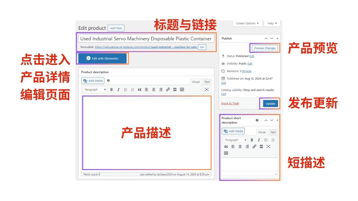 - Product description为产品详情模块,可以用默认编辑器,也可以点击【Edit with Elementor】按钮改为用Elementor编辑(可调用Elementor部件)。