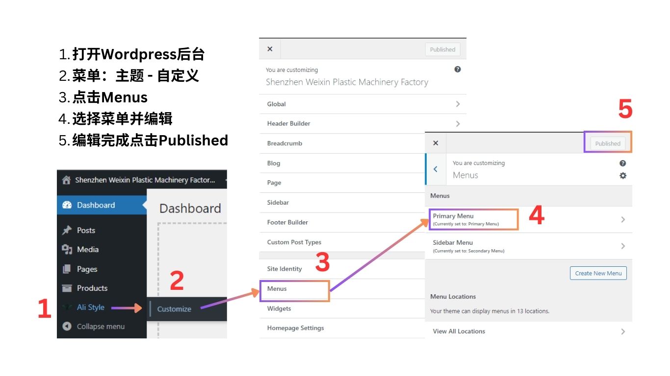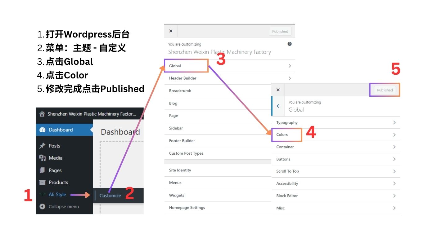 WordPress后台左侧菜单 – 主题 – Customize – Global – Colors – … – 修改完成时点击【Published】按钮