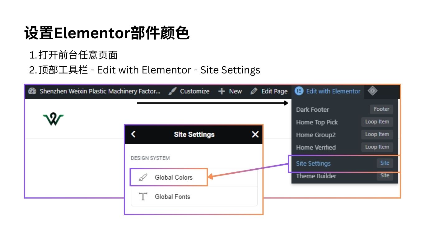 登录Wordpress管理员账号 – 打开前台任意页面 – 光标悬浮在顶部工具栏的【Edit with Elementor】 – 点击【Site Settings】 – 点击【Global Colors】