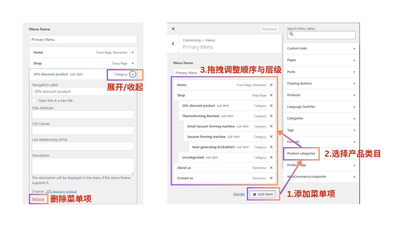 点击Add Items可以添加新的菜单项,最常用的选项是添加产品类目(需要提前在Products – Categories中创建该产品类目),也可以添加站内页面或站外链接。