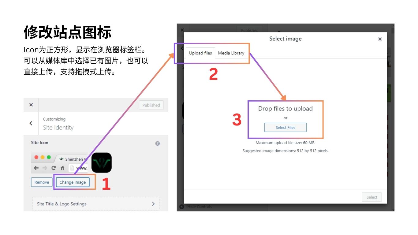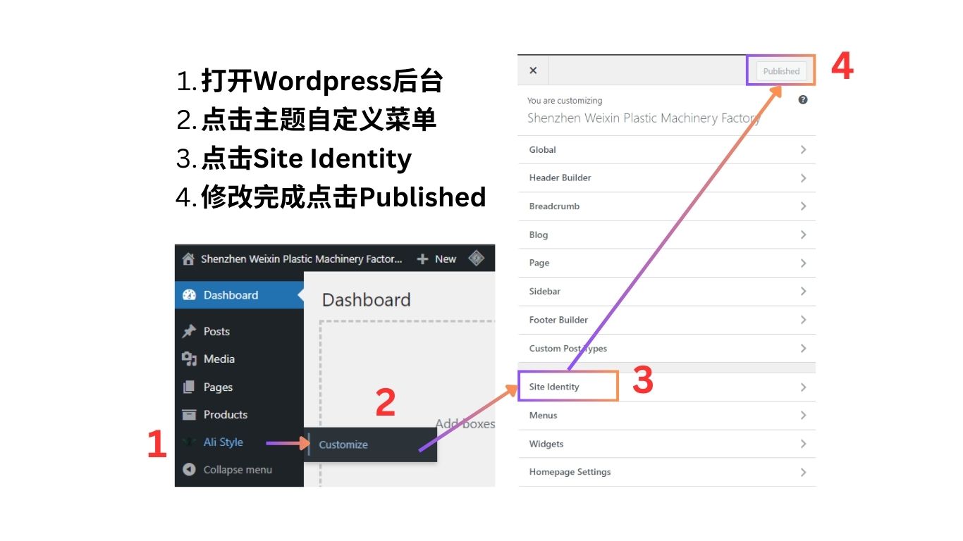 登录Wordpress后台 – 左侧菜单栏 – 鼠标悬浮在主题上 – 点击主题下的Customize选项 – 在主题自定义界面中点击【Site Identity】 – 修改完成后,点击【Publised】按钮
