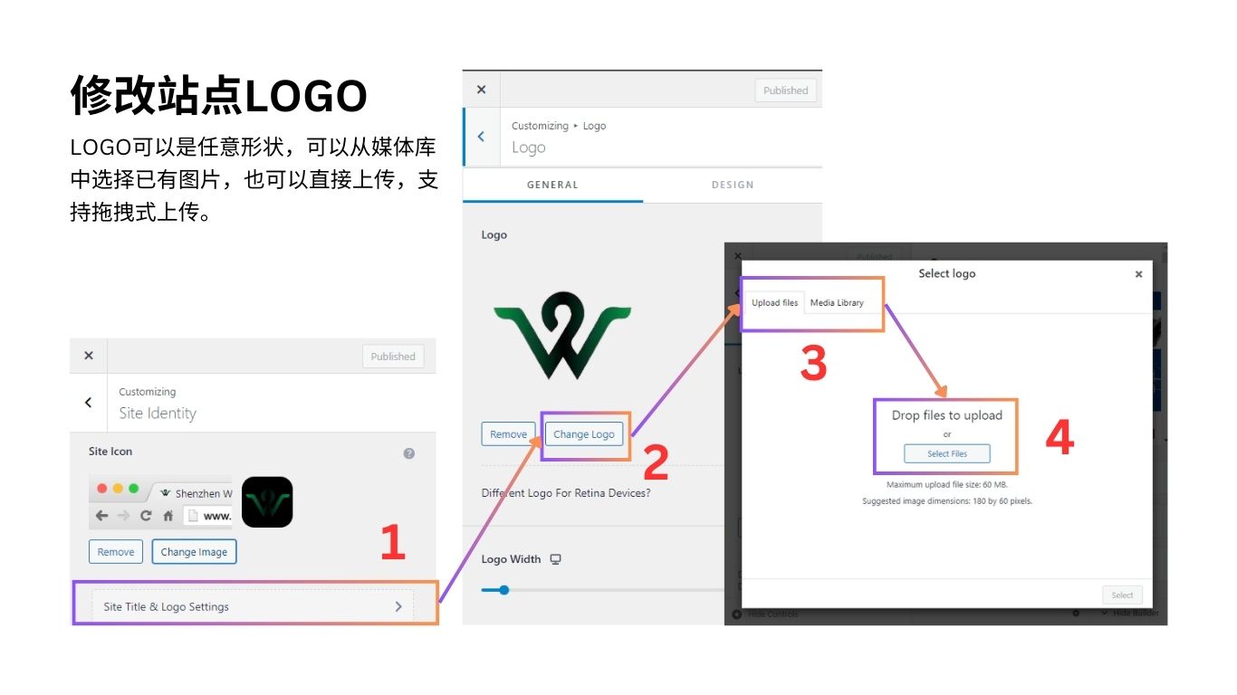 点击Site Identity下的【Site Title & Logo Settings】 – 点击Logo下的【Change Logo】按钮修改站点logo。建议上传PNG图片。
