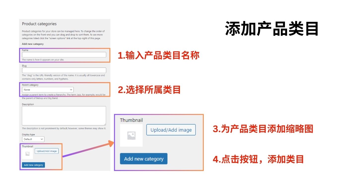 输入产品分类名称 – 选择父级类目(没有选择None) – 填写产品描述(可选,SEO友好) – 上传产品类目图片(可选) – 点击【Add new category】按钮