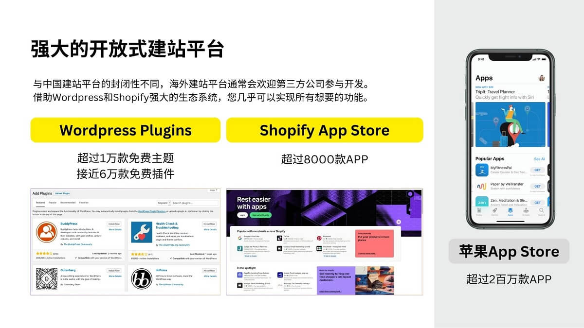 WordPress和Shopify都是开放式的大型生态系统,页面编辑、网站备份、网站SEO等各个领域都有专业的公司为其开发插件。而国内的建站公司都是封闭式的,全部功能都由一家公司开发,很难有竞争力。